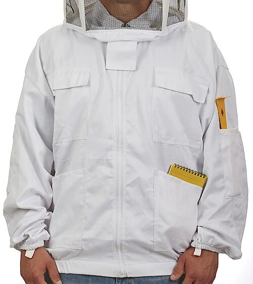 Look great for your bees and protect yourself, too, with the Little Giant Beekeeping Jacket. Made from 100% cotton, this generously cut deluxe jacket comes with a self-supporting domed veil. The veil is attached using a heavy-duty, two-way cloth zipper that allows it to be easily removed, and a fuzzy fastener at the front of the jacket ensures extra protection from stray bees. The veil can also be left on and allowed to hang like a hood when not in use. An elastic waistband and wrist cuffs help keep out the bees and provide an adjustable fit. The jacket features four roomy front pockets for all your beekeeping essentials and an additional pocket that is the perfect size for a hive tool. This buzzworthy jacket provides a great alternative to a full bee suit when inspecting your hives!