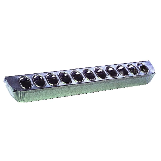 This classic Little Giant Metal Slide-Top Poultry Ground Feeder is the ultimate feeding station with a metal slide top for adult chickens and other birds. It features 22 feeding holes (11 on each side). The covered top helps keep debris out of the feed, while individual holes minimize waste. The top slides off for easy filling and cleaning. Made of heavy-gauge galvanized steel for years of service, the feeder has rolled edges for safety. Measures 18.5 inches long by 3.75 inches wide by 2.5 inches high.