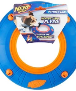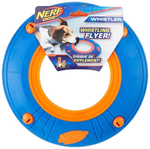 - The bright blue and orange colors make it easy for you to spot on the ground or wherever it ends up, plus it makes a thrilling whistling noise that dogs love.