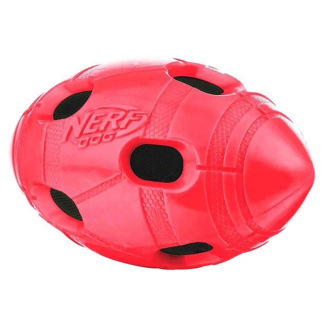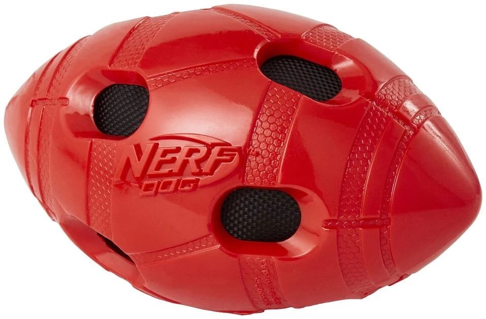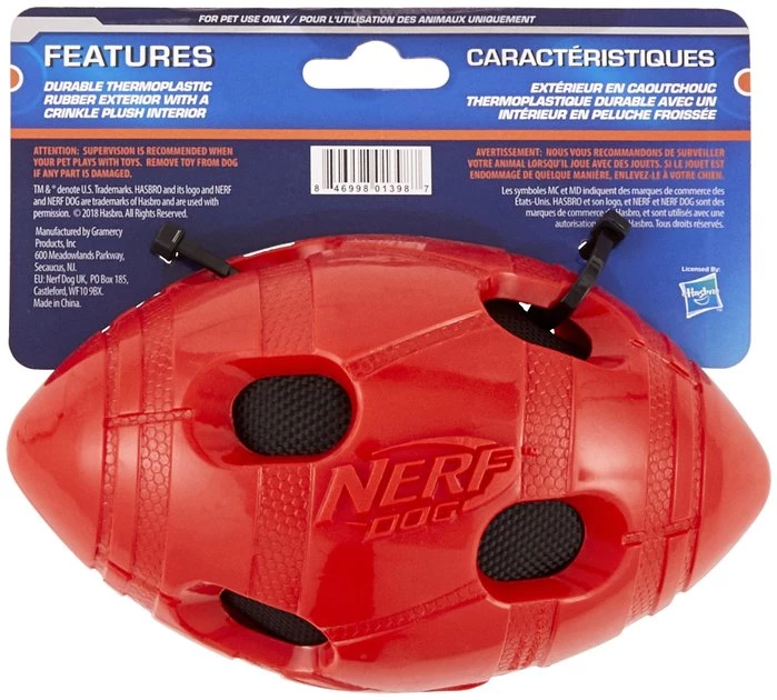 Take your game of fetch to the next level with the innovative Nerf Dog Crunchable Football Dog Toy. This interactive toy has two different exciting textures. Inside is a nylon material with an intriguing center that makes irresistible crunching and squeaking noises when your pup catches it. The rubber exterior gives you a good grip, so you can throw the Crunchable Football even farther. This medium is just the right size for throwing the perfect spiral. It’s water- and weather-resistant to stand up to water, mud, rain, drool or sweat. And it floats in water, so you can have fun at the beach or in the pool. It’s a crackling, rolling, dog-worthy and overall exciting retrieval toy.