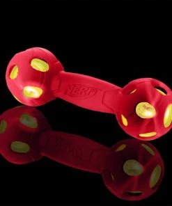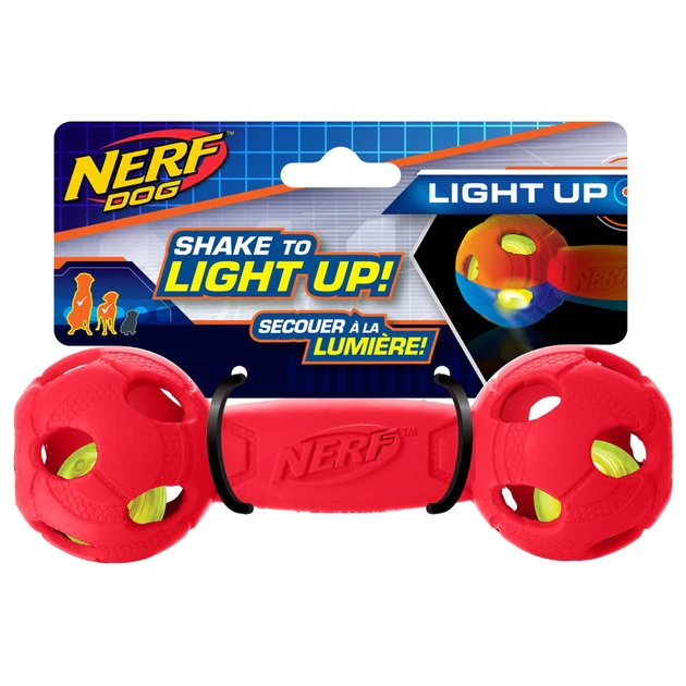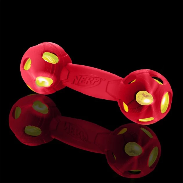 Watch your best buddy go crazy and pounce on the Nerf Dog LED Bash Barbell Dog Toy. This barbell-shaped toy lets him chase, chew and smush for hours of fun with a rubber exterior and a light-up LED design that keeps him engaged. Created with a barbell shape perfect for gripping between his teeth, this toy helps him to hold his chomp during the even most tail-wagging games.