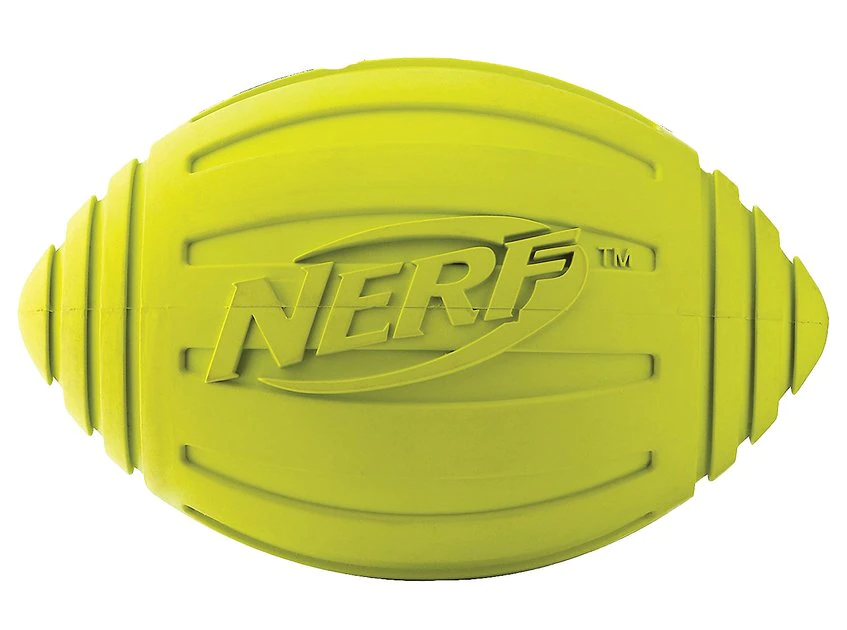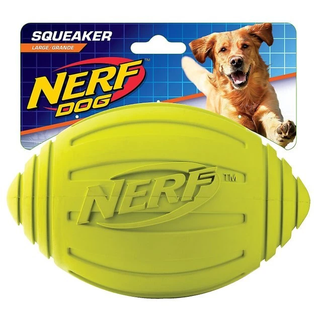 Get ready for a playtime blitz with the Nerf Dog Ridged Squeak Football Dog Toy. This play-ready ball comes with a built-in squeaker for the loud fun dogs love. Made with durable rubber, it can stand up to some pretty tough chasing, bouncing and tossing—which means it’s great for playing fetch. It’s designed with a unique ridged pattern that makes it easy to grip, even when it gets slobbery! Plus, it’s made of water-resistant, food-grade, 100% non-toxic rubber for longer-lasting play.