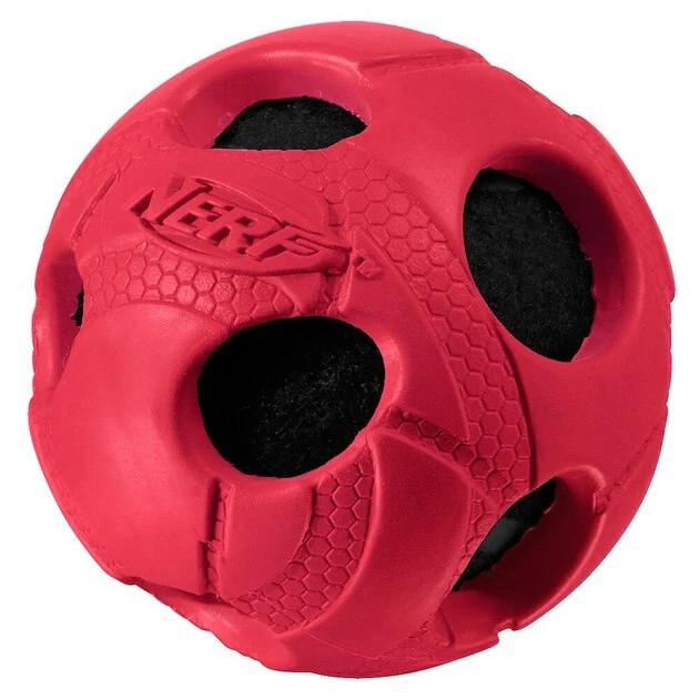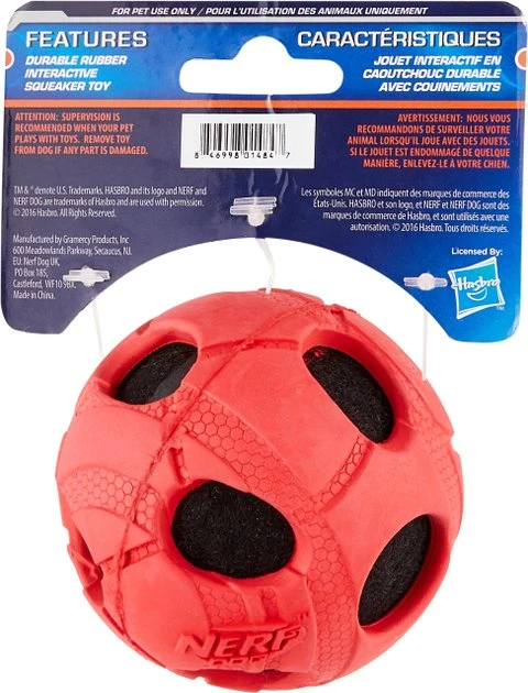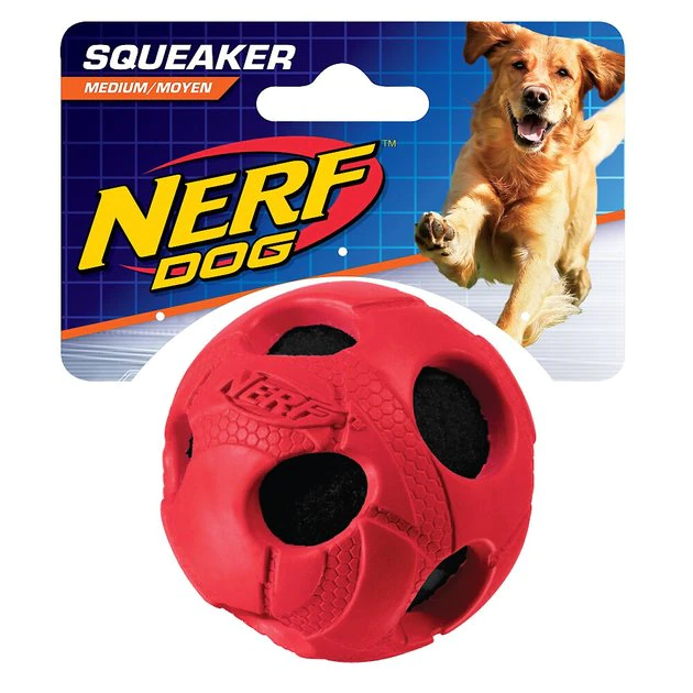 The Nerf Dog Squeaker Ball Dog Toy was made for tossing, throwing and bouncing. It’s got a tough rubber exterior with a textured design so it won’t slide out of your hand or your dog’s mouth, no matter how slobbery it gets. Just squeeze the ball a couple times, and his ears will perk up when he hears the exciting squeaking noise. You’ll have his full attention with this fun, brightly colored interactive toy.