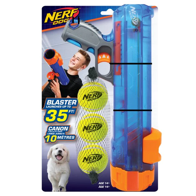 Make playtime fun for her and easy for you with the Nerf Dog 12-in Tennis Ball Translucent Blaster Dog Toy Kit. Keep your furry gal active and in the game with a blaster, which lets you shoot a ball up to 35 feet away from a hand-held plastic mini-cannon without hurting your shoulder, and three included tennis balls. Translucent for a cool look whether you’re playing in the yard, the park or at the beach, this interactive kit helps gets you both back in the game.