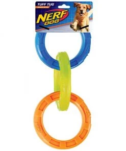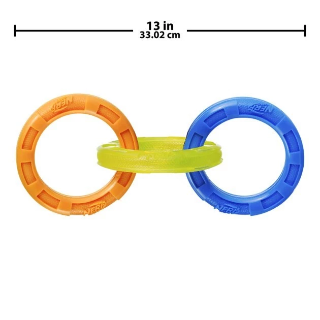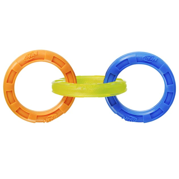 Give your energetic pal a durable toy optimized for extra-tough tugging and roughhousing with the Nerf Dog Tuff Tug 3 Ring Dog Toy. Thanks to its unique design with two durable rubber rings, it’s perfect for action-packed games of tug your pal can enjoy with you, or with other friendly pups. It’s built with high-performance thermoplastic rubber to stand up to extended rounds of fetch and tugging, so it’s the go-to toy for active pups. When it’s time to relax and store the toy, cleaning doggie drool and dirt is a cinch by just hand washing or wiping away. Plus, thanks to its waterproof design, it’s ideal for water-loving pups at the beach, lake, pool, or your favorite spot!