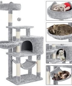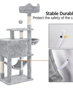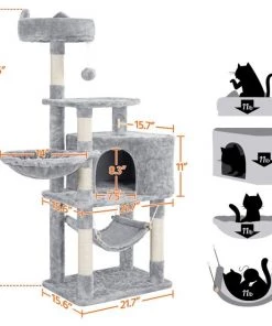 Give your fine feline friends a fantastic place to frolic with Yaheetech 3-Level Plush Cat Tree! Constructed of solid boards and connected with durable metal accessories, this sturdy cat tree is covered with soft plush that will keep tender paws comfortable. With five sisal rope bound poles, a roomy condo, three levels of spacious platforms, a hammock, and a basket cradle, this multifaceted cat paradise is bound to entertain even the most finicky of felines! The rounded edges prevent any kitties or cat servants from hurting themselves, and the middle platform has a secure anti-topple strap that ensures everything stays in place when your kitties rocket around during playtime. This structure is ideal for two average sized cats or two to three kittens.