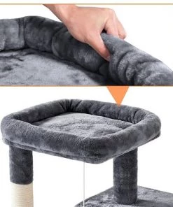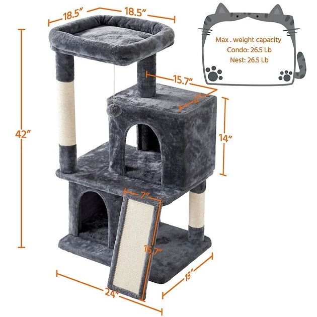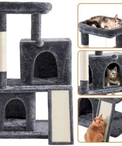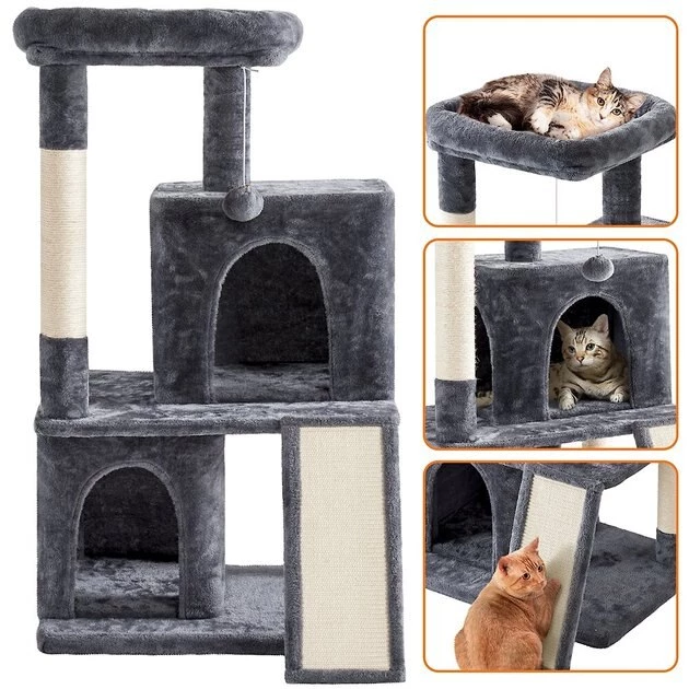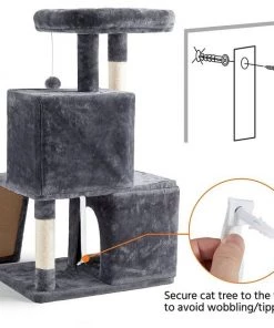 The Yaheetech 3 Tiers 42-in Plush Cat Tower with Double Cat Condo offers your kitty the purr-fect place to play and catch a cat nap. The three tiers include a higher perch with raised cushion edges for snoozing. Each condo has two doors for easy entrances and exits. The fully-wrapped scratching posts and board encourage your furbaby to exercise his paws, rather than using your furniture. Natural sisal ropes and cozy plush are highly durable, so your kitty can get plenty of use out of this tower.