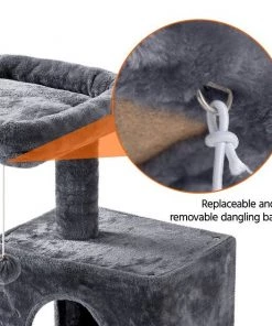 - Plush cat house has a high-edged perch with a furry ball, 2 condos with 2 doors, 2 scratching posts, and 1 lower scratching board for tons of fun.