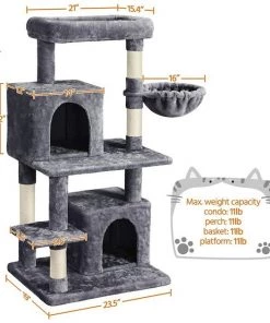 - Features two enclosed cat condos for hiding and sleeping.