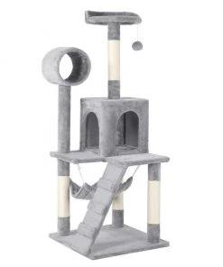 Give your cool cat the purr-fect place to chill and play with the Yaheetech 51-in Plush Cat Tree & Condo. Ideal for one or two kittens or small cats to enjoy, this sturdy, multi-level cat tree is constructed of eco-friendly particle board, cozy plush material and natural sisal rope. Multiple scratching posts let your kitty indulge her natural scratching instincts—and help prevent her from ruining your furniture. The included hammock is the paw-fect place to lounge after a day of fun exploring the tunnel and climbing the ladder.