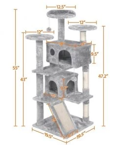 The Yaheetech 55-in Plush Cat Tree & Condo offers one or more of your feline friends the purr-fect all-in-one, home sweet home. This roomy, multi-level cat tree is constructed of sturdy particleboard covered with soft, plush fabric. Natural, sisal-rope-wrapped posts give your paw-tners plenty of places to unleash their natural scratching instincts—while the included, hanging fur balls are paw-fect for batting fun. When your purring pals are ready for a cat nap, they can choose from the inviting perches and cozy condos.