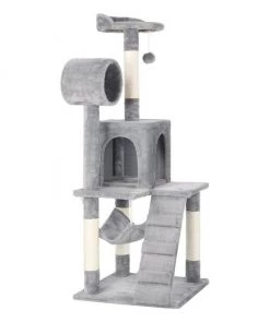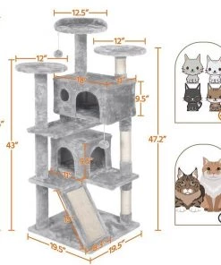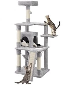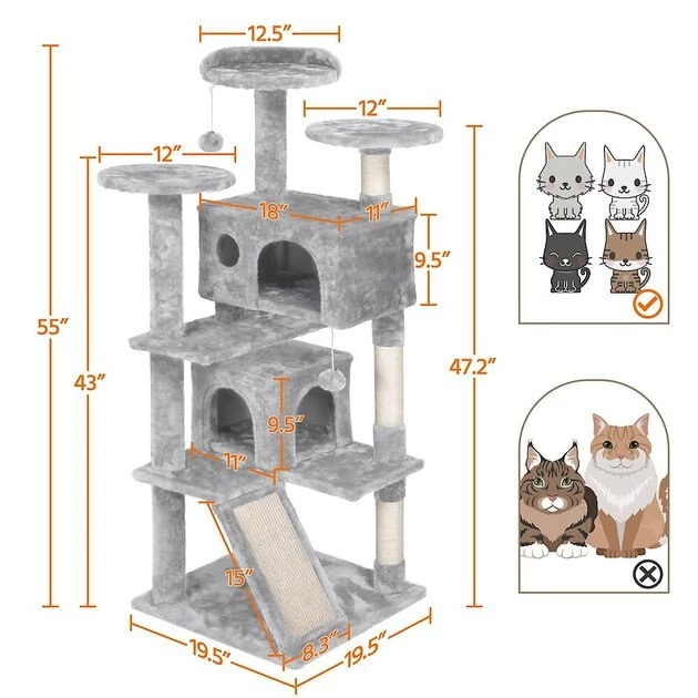 Give your kitty a fabulous place to call her own with the Yaheetech 55-in Plush Cat Tree and Condo. This cat tree condo features lots of room for more than one furry feline to scratch, explore or snooze. Two fluffy condos give your kitties a special spot to curl up for an epic cat nap and the perching platforms are purr-fect for the kitty who enjoys a good lookout. It also includes two entertaining and interactive fur balls to bat around as well as a natural sisal-covered scratching post to encourage paw-sitive scratching behavior. This fun activity center features added stability and security for your furry friends with a reinforced base and anti-toppling fittings. As a bonus, it’s made with safe and environmentally-friendly materials—so you can feel good about your kitties’ new favorite fun spot!