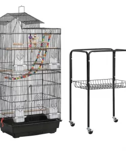 Cage, Rolling Stand, Plastic Bottom, Plastic Feeders, Wooden Perches, Toys, Ladder, Swing.