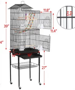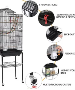 Give your sidekick somewhere to spread his wings with the Yaheetech 62.5-in Rolling Bird Cage & Detachable Stand. This large bird cage is crafted to sit atop a detachable stand that rolls smoothly using four 360-degree swivel casters. It features three polished wooden perches, four eco-friendly feeders and a thoughtful design that gives your pal plenty of room to play. This large bird cage is crafted for convenience with two side-opening composite doors and seven small doors with assembling feeders. It is equipped with arc-shaped wire locks, a fully painted smooth surface and two buckles that secure the bottom tray to the cage.