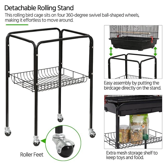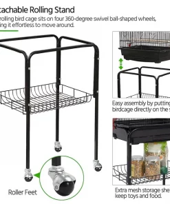Cage, Slide-Out Tray, Storage Shelf, Rolling Rack, Wooden Perches, Mesh Panel, Plastic Feeders, Swing, Storage Shelf.