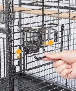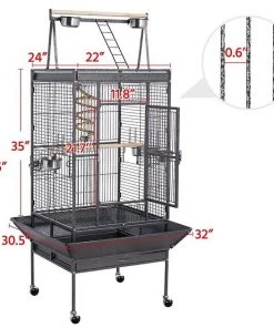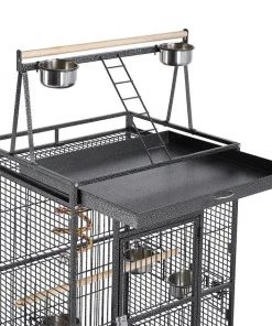 - Includes polished wooden perches, stainless steel feeders and four swivel casters.
