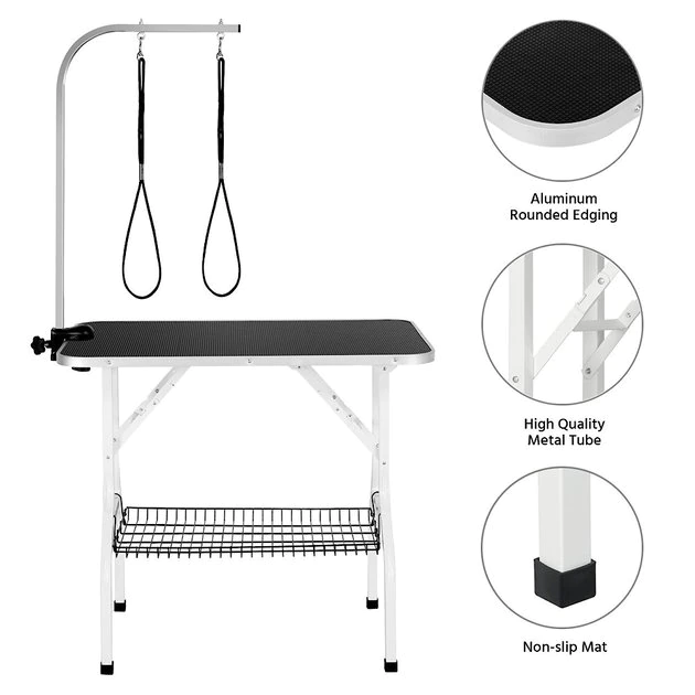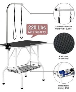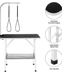 - Heavy-duty pet grooming table features a powder-coated iron frame.