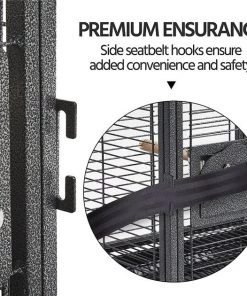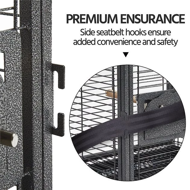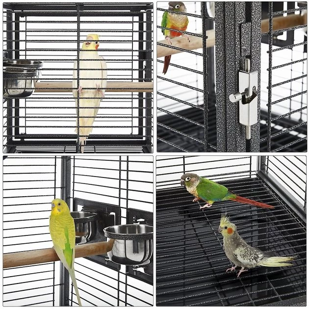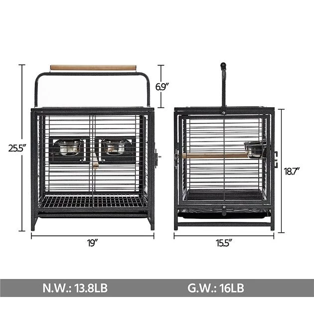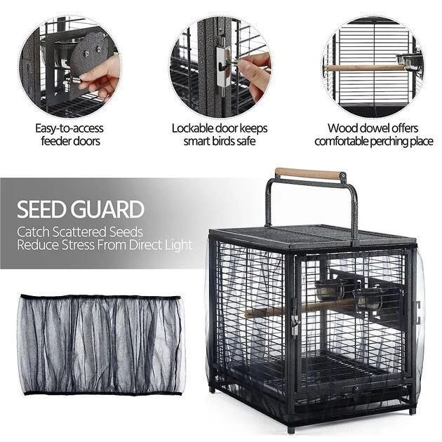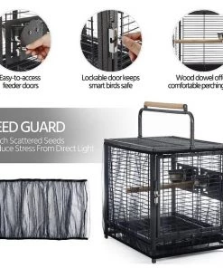 The Yaheetech Iron Travel Bird Cage Carrier is constructed from powder-coated wrought iron that has a beautiful hammered finish. This durable travel cage is resistant to water and the long-wood perch handle provides you with a convenient grip when transporting the cage. The stainless steel feeders can be accessed from outside the cage through the feeder doors, while the seed guard and pull-out litter tray catch all the scattered seeds.
