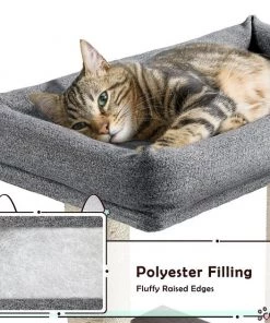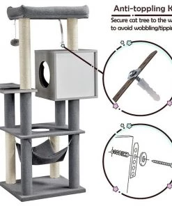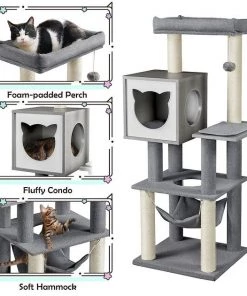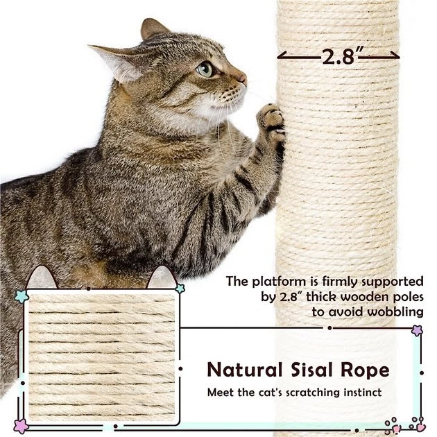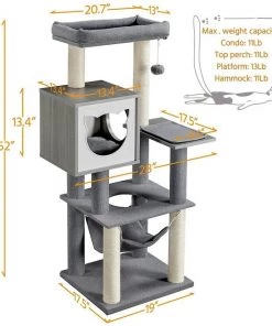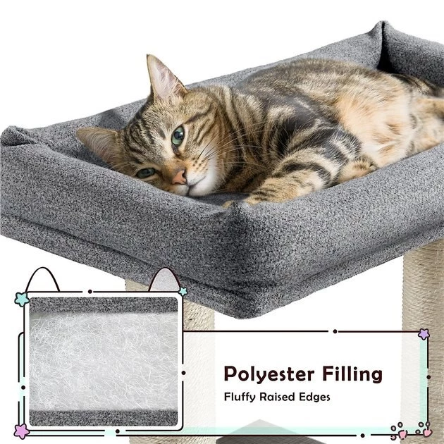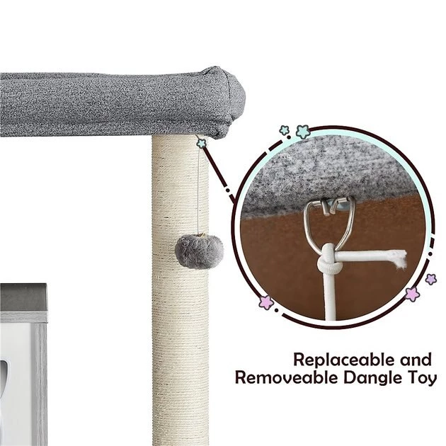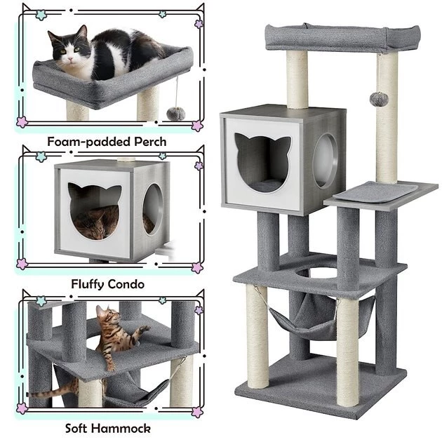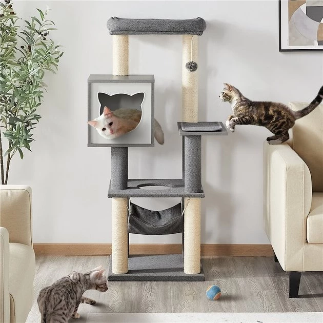 Variety is the name of the game when it comes to keeping cats occupied and entertained. The Yaheetech Multi-Level 52-in Felt Cat Tree & Condo features multiple levels for cats to play, sleep and sharpen their claws. Constructed of particle board, natural sisal, and skin-friendly soft plush fabric, it’s equal parts durable and comfortable. The cat tree has a top perch with raised edges, a cute wooden cat house, a small extended platform, a hanging hammock, and several scratching posts.