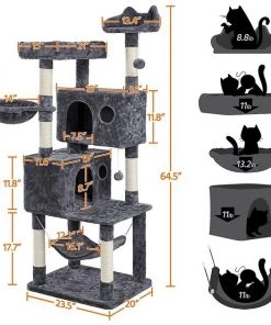 The Yaheetech 64.5-in Multi-level Cat Tree has everything your feline friend’s heart could desire! This cat tree features multiple tiers and structures for your kitties to play and lounge. It includes two platforms, a basket, two condos with windows, six scratching posts and two furry balls. It even helps keep your kitty’s claws away from your furniture! This cat tree is crafted with a soft covering so that your cat has a comfortable place to chill out. Plus, it comes with a strap attached, which can be used to fasten the tree to a wall.
