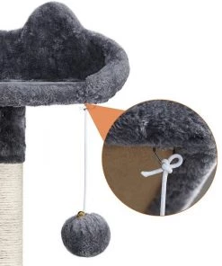- Includes two platforms, a basket, two condos with windows, six scratching posts and two furry balls.