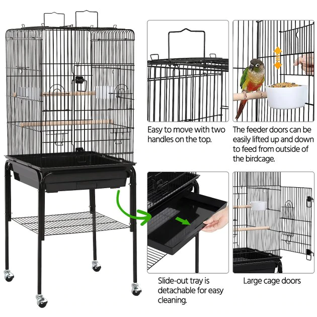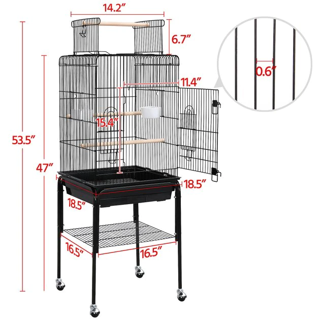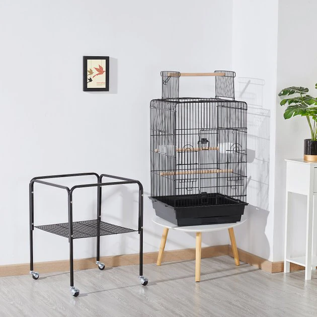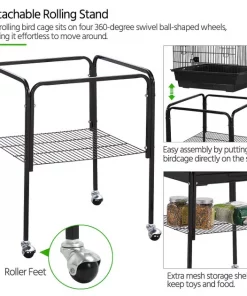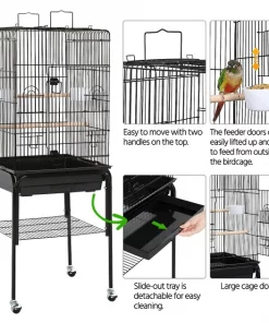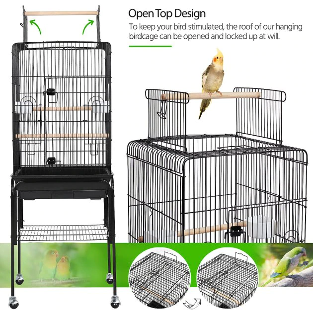 Give your beaked buddies a fine place to stretch their wings with the Yaheetech Play Top Detachable Rolling Stand Metal Bird Cage. This spacious abode features an open play top that lets your feathered friends perch and play and interact with you! It comes with two feeders and two sanded wood interior perches to help your birds feel comfy and right at home. The detachable rolling stand with shelf makes for easy movement and tidy storage, while the easy-clean slide out tray makes maintenance a breeze. This cage is a perfect choice for pet parents seeking versatility and ease!