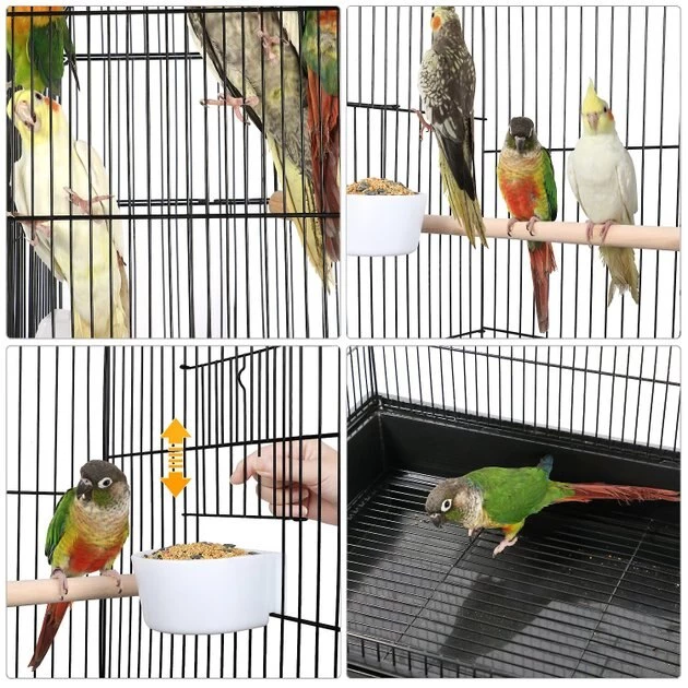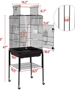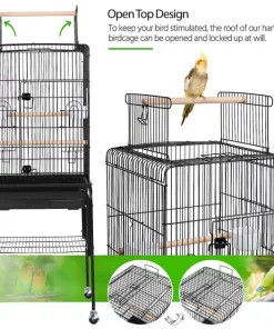 - Spacious bird cage features an interactive play top that can be propped open with the included perch or securely closed to keep birds safely in.