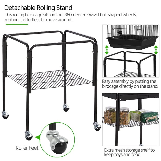 - Storage shelf on the stand provides space for storing cleaning tools, bird seed, toys and more.