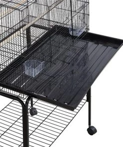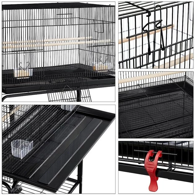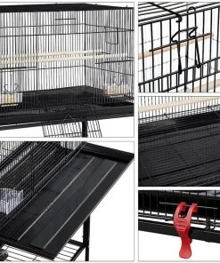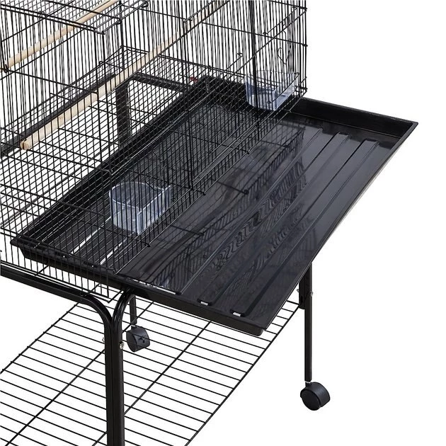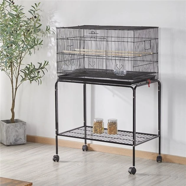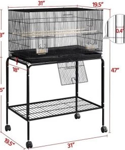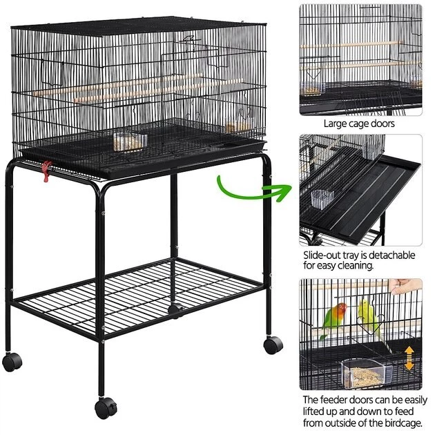 Your birds will enjoy perching and playing in the Yaheetech Rolling Stand Extra Space Wood Perches Bird Cage. This roomy cage has enough space to house several parakeets, canaries or finches together, plus plenty of room to include fun decorations and toys. It has multiple doors that open in various directions, making changing food, water and toys out safe and easy while preventing escapes. A wheeled base with brakes makes the cage easy to relocate, or you can remove it to put the cage on a table or to take it with you for travel. Lightweight material makes this cage very portable, and it comes partially pre-assembled with clear instructions for putting the rest together. You and your feathered friends will love the easy versatility of this cage!