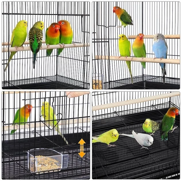 - Spacious design provides plenty of room for 5-6 pet birds, plus ample space for toys, decorations and the two included perches and feeders.